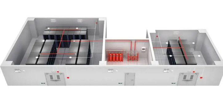 機房消防報警及滅火系統采用有管網全淹沒方式,并采用氣體滅火劑,探測器配置方式為智能感煙探測器、智能感溫探測器搭配,只有兩種探測器同時報警,氣體滅火系統才會發生聯動,同時還設有遠程手動啟動及機械手動方式。